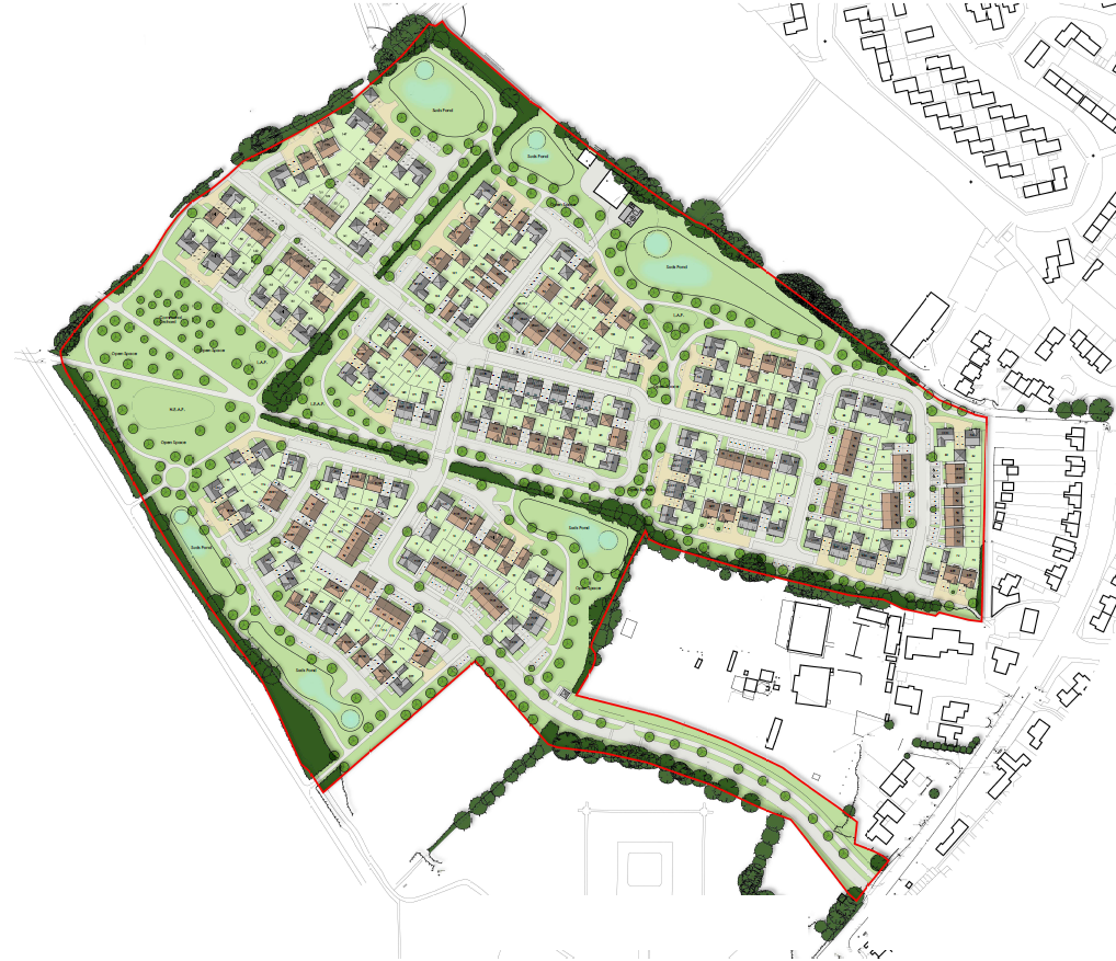Following an Outline planning permission for 225 new homes (granted at appeal in 2021) Barratt David Wilson Homes achieved Reserved Matters consent in August 2023 for the development. A range of 1-4 bedrooms homes can now be provided in the form of terraced, semi-detached and detached houses, including 67 affordable homes within the following tenures: affordable rent, shared ownership and, subject to a current application, First Homes. The scheme will also deliver the following community facilities on site: