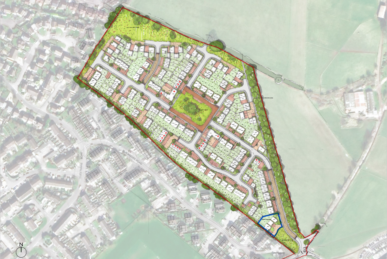 This site is located to the north east of Shaftesbury, to the north of Wincombe Lane and Blackmore Road, and south east of Wincombe Business Park. This was the subject of a planning application 191 homes, back in 2014 (ref: 2/2014/1350/FUL). This was given permission in 2016, and (after planning conditions were agreed with the Council), a material start was made on site. The site has also been included in the Shaftesbury Neighbourhood Plan and the North Dorset Local Plan. Although several years have passed, we remain committed to bringing development forward, albeit the circumstances are now quite different and our designs for the site have been updated. In April 2021 we submitted a planning application to Dorset Council for an updated planning permission. The main points to note in this are: